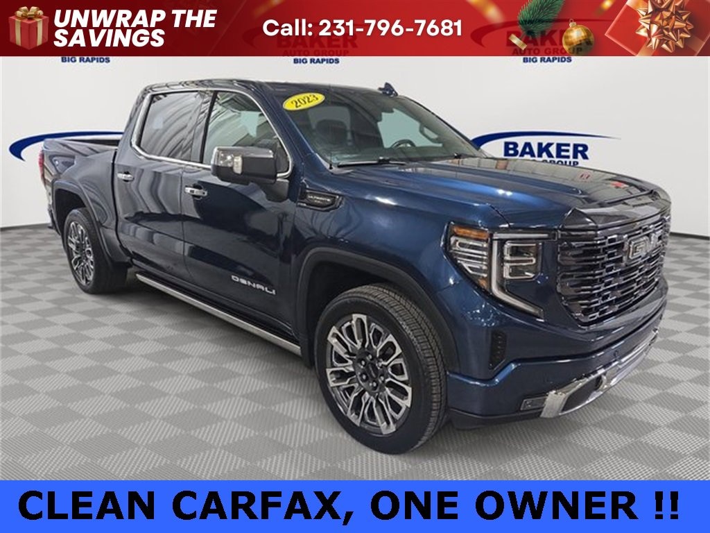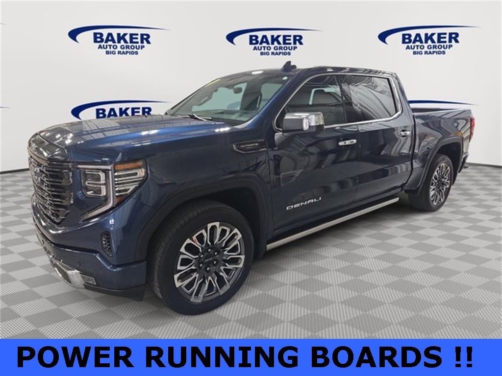 Pacific Blue Metallic 2023 GMC Sierra 1500 Denali Ultimate 4WD 10-Speed Automatic EcoTec3 6.2L V8 LOCAL TRADE, NON SMOKER, DETAILED, OIL CHANGE, APPLE CARPLAY, ANDROID AUTO, 1 OWNER, NO ACCIDENT AUTO CHECK, **SUPER CRUISE**, 10-Speed Automatic, 4WD, Alpine Umber Leather, 120-Volt Bed Mounted Power Outlet, 120-Volt Instrument Panel Power Outlet, 16-Way Power Driver Seat Adjuster w/Lumbar, 16-Way Power Passenger Seat Adjuster w/Lumbar, 2 Charge/Data USB Ports Inside Center Console, 2 Type-C Charge-Only Rear USB Ports, 2 USB Ports, Apple CarPlay/Android Auto, Auto-Locking Rear Differential, Bed View Camera, Bose Premium Series w/12-Speaker System, Cargo Convenience Package, Chrome Recovery Hooks, Color-Keyed Carpeting Floor Covering, Compass, Console-Mounted Safe (LPO), Deep-Tinted Glass, Driver Memory, Electric Rear-Window Defogger, Electrical Steering Column Lock, Floor-Mounted Center Console, Front Bucket Seats, Front Rainsensing Wipers, GMC Connected Access Capable, HD Surround Vision, Heads-Up Display, Heated 2nd Row Outboard Seats, Heated Driver & Front Outboard Passenger Seating, Heated front seats, Heated rear seats, Heated steering wheel, Heavy-Duty Air Filter, Hill Descent Control, Hitch Guidance, Hitch Guidance w/Hitch View, In-Vehicle Trailering App, Integrated Trailer Brake Controller, Keyless Open & Start, LED Cargo Area Lighting, Memory seat, Multicolor 15 Diagonal Head-Up Display, MultiPro Audio System by Kicker (LPO), Navigation System, OnStar & GMC Connected Services Capable, Perimeter Lighting, Power Door Locks, Power driver seat, Power Front Passenger Windows w/Express Up/Down, Power Front Windows w/Driver Express Up/Down, Power moonroof, Power passenger seat, Power Rake & Telescoping Steering Column, Power Rear Windows w/Express Down, Power Sliding Rear Window w/Rear Defogger, Power Sunroof, Preferred Equipment Group 5SB, Push Button Start, Rear Cross Traffic Braking, Rear Pedestrian Detection, Rear Underseat Storage (LPO), Rear Wheelhouse Liners, Remote Vehicle Starter System, SiriusXM w/360L, Spray-On Pickup Bed Liner w/Denali Logo, Steering Wheel Audio Controls, Theft Deterrent System (Unauthorized Entry), Trailer Camera Provisions, Trailer Side Blind Zone Alert, Trailer Tire Pressure Monitor System, Trailering Package, Ultrasonic Front & Rear Park Assist, Universal Home Remote, Vader Chrome Header w/Signature Denali Grille, Ventilated Driver & Front Passenger Seats, Wi-Fi Hotspot Capable, Wireless Charging, Wireless Phone Projection.CALL 231-796-7681 TO SCHEDULE YOUR TEST DRIVE TODAY!